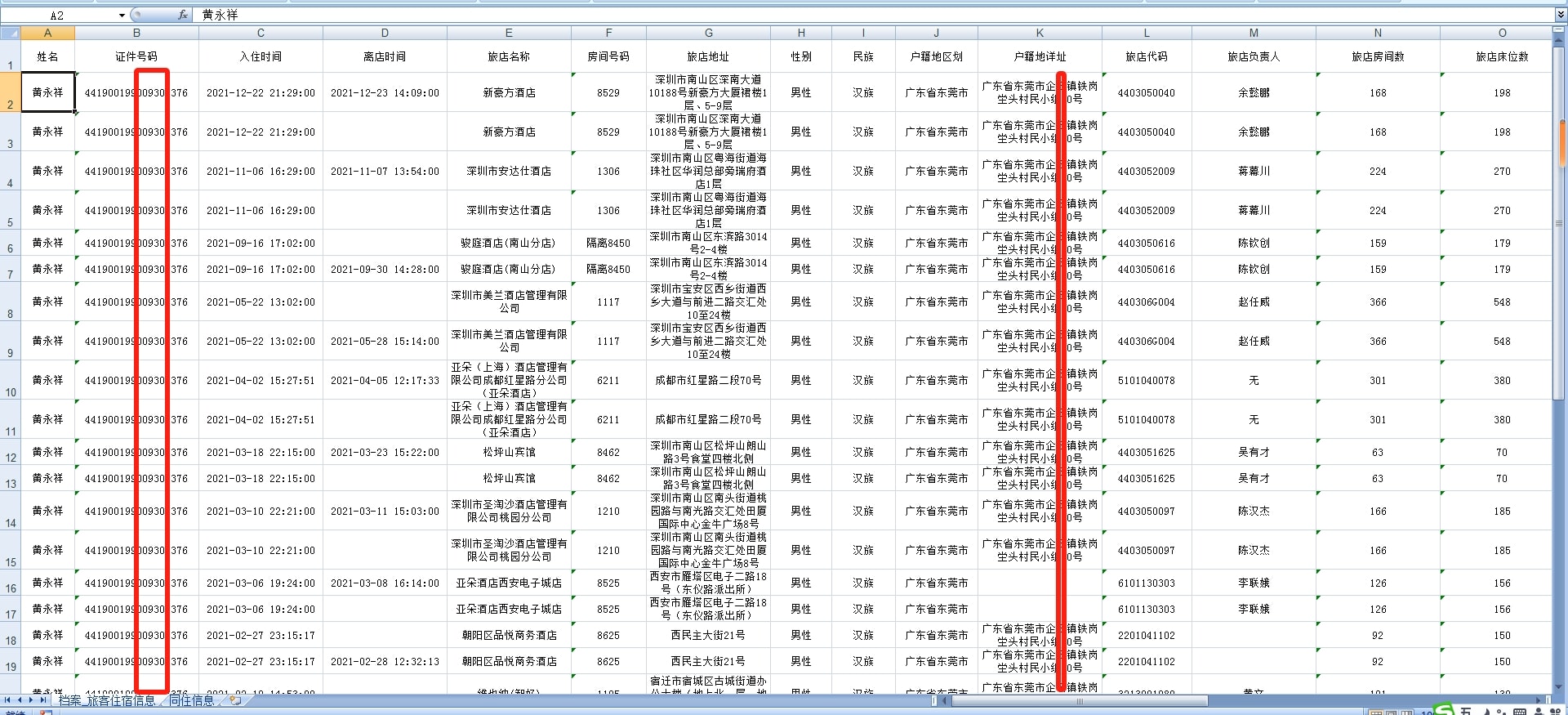 同住记录包括:酒店名称、酒店地址、酒店编号、房号、入住日期(或可能包括具体时间)。